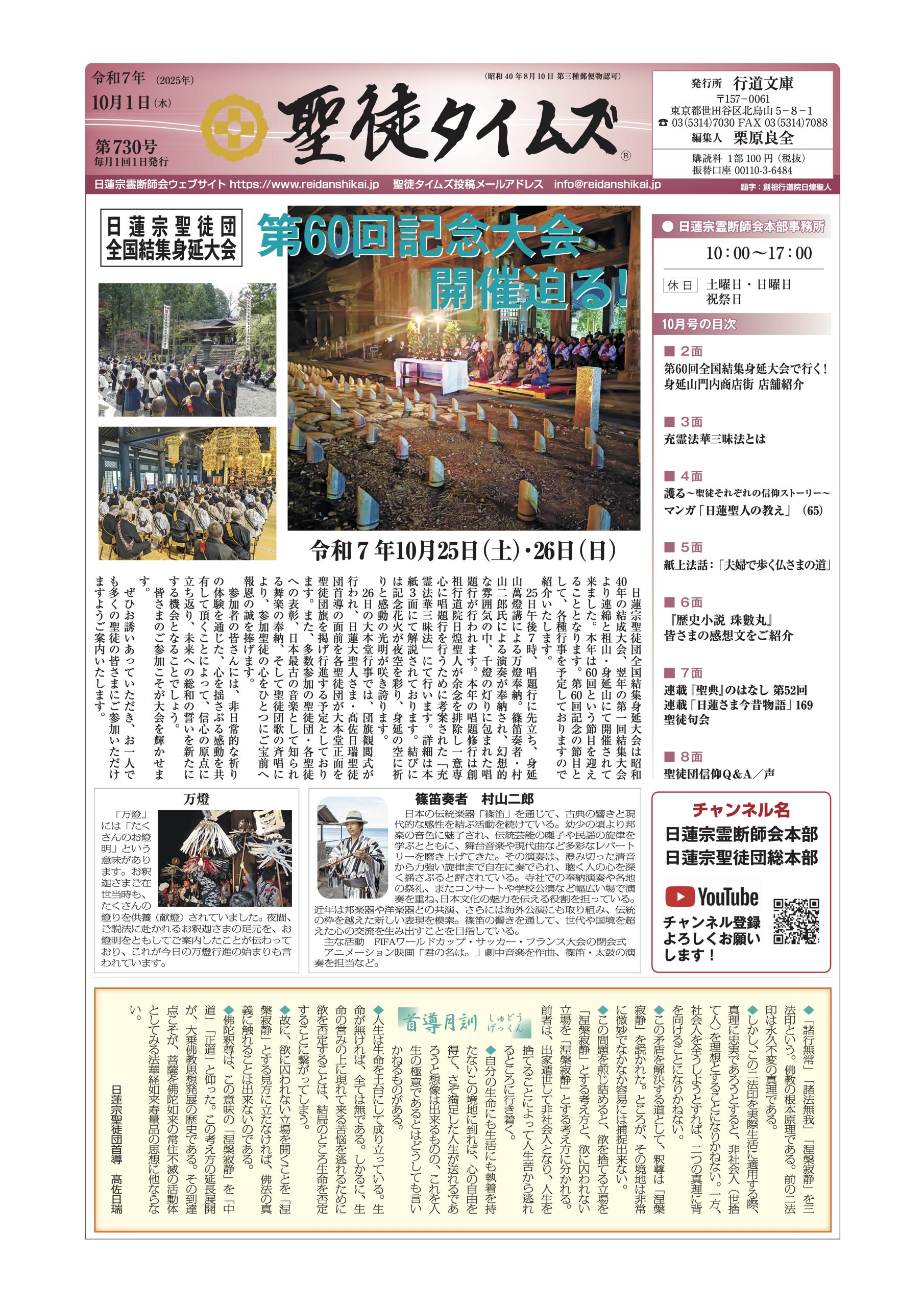 日蓮宗聖徒団全国結集身延大会は昭和40年の結成大会、翌年の第一回結集大会より連綿と祖山・身延山にて開催されて来ました。本年は60回という節目を迎えることとなります。第60回記念の節目として、各種行事を予定しておりますので紹介いたします。 25日午後7時、唱題行に先立ち、身延山萬燈講による万燈奉納。篠笛奏者・村山二郎氏による演奏が奉納され、幻想的な雰囲気の中、千燈の灯りに包まれた唱題行が行われます。本年の唱題修行は創祖行道院日煌聖人が余念を排除し一意専心に唱題行を行うために考案された「充霊法華三昧法」にて行います。詳細は本紙3面にて解説されております。結びには記念花火が夜空を彩り、身延の空に祈りと感動の光明が咲き誇ります。